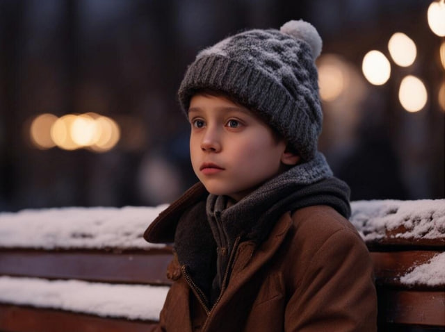 Вдруг он услышал детский плач. Посмотрел по сторонам и увидел на скамье мальчика в коричневом пальто и серой шапочке. Он громко плакал, размазывая слёзы по щекам.